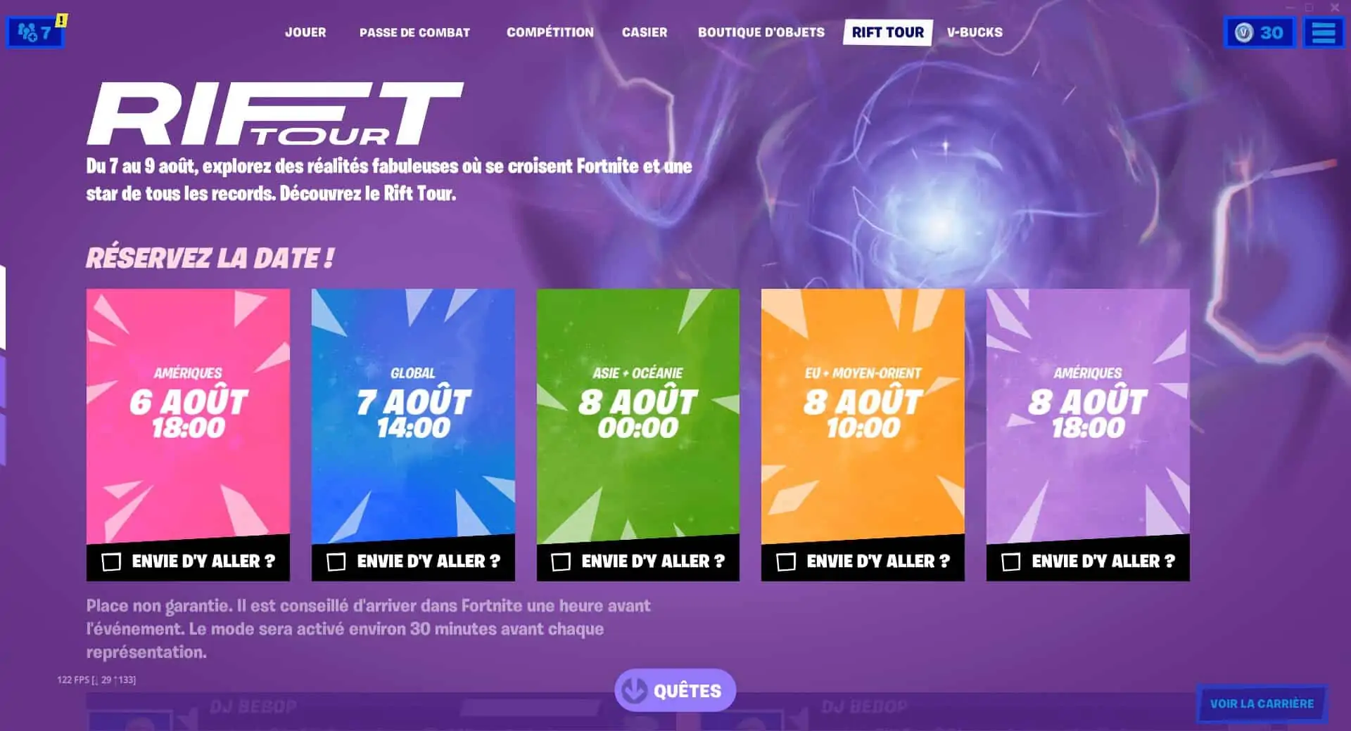 Comme le Rift Tour sera composé de cinq spectacles répartis sur trois jours, Fortnite a ajouté un onglet Rift Tour dans le menu du Battle Royale. Cet onglet permet d’indiquer à quelles représentations les joueurs souhaitent participer et suivre l’avancée des quêtes. Elles permettent dans l’immédiat de déverrouiller l’écran de chargement Câlins cosmiques dessiné par Delicious Design League, l’aérosol Faille de maître et l’emote Minou nuage. A noter que toute personne participant au Rift Tour recevra le parapluie commémoratif Perce-nuages câlin. Enfin, les membres du Fortnite Crew (abonnement payant) qui se connecteront entre le 5 août à 16h et le 9 août à 16h pourront récupérer le parapluie Perce-nuages arc-en-ciel, l’écran de chargement Skye au sommet et une bannière thématique du Rift Tour.