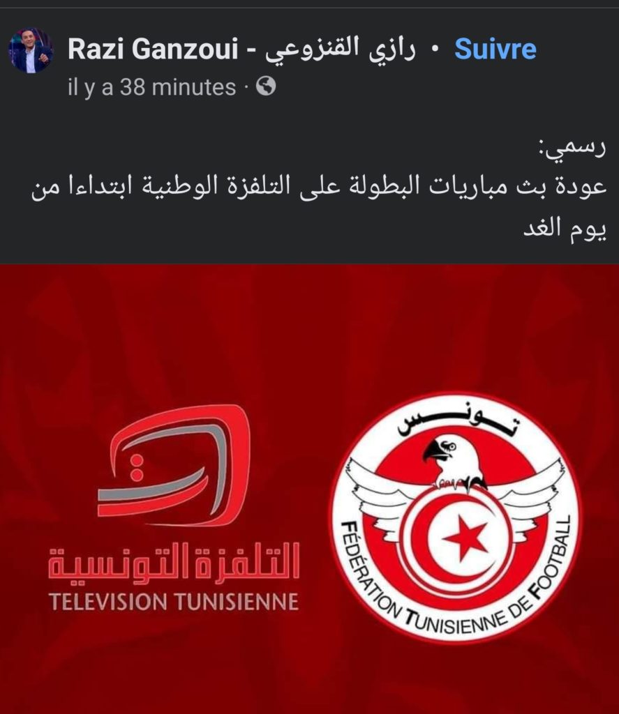 بنسبة كبيرة ستعود التلفزة التونسية لبث مباريات البطولة الوطنية ابتداءا من هذا الأسبوع في انتظار رد الجامعة حول قبول المسار القضائي للديون المتخلدة كما ورد في بلاغ التلفزة