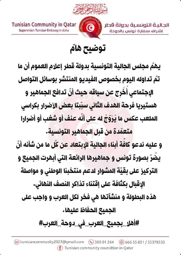 وتابع الخطاب: «بالمناسبة لا يفوتنا أن نتوجه بالشكر مجددا لكل الجماهير والعائلات التونسية في قطر وفي تونس وفي كل أنحاء العالم، ولمجلس الجالية التونسية في قطر الذي يسعى بدوره مع الجهات القطرية للترفيع في عدد التذاكر، وضمان دخول أكبر عدد ممكن من الجماهير التونسية لمساندة المنتخب التونسي، كما نشكره على سؤاله الدائم على الوفد التونسي الموجود في قطر».