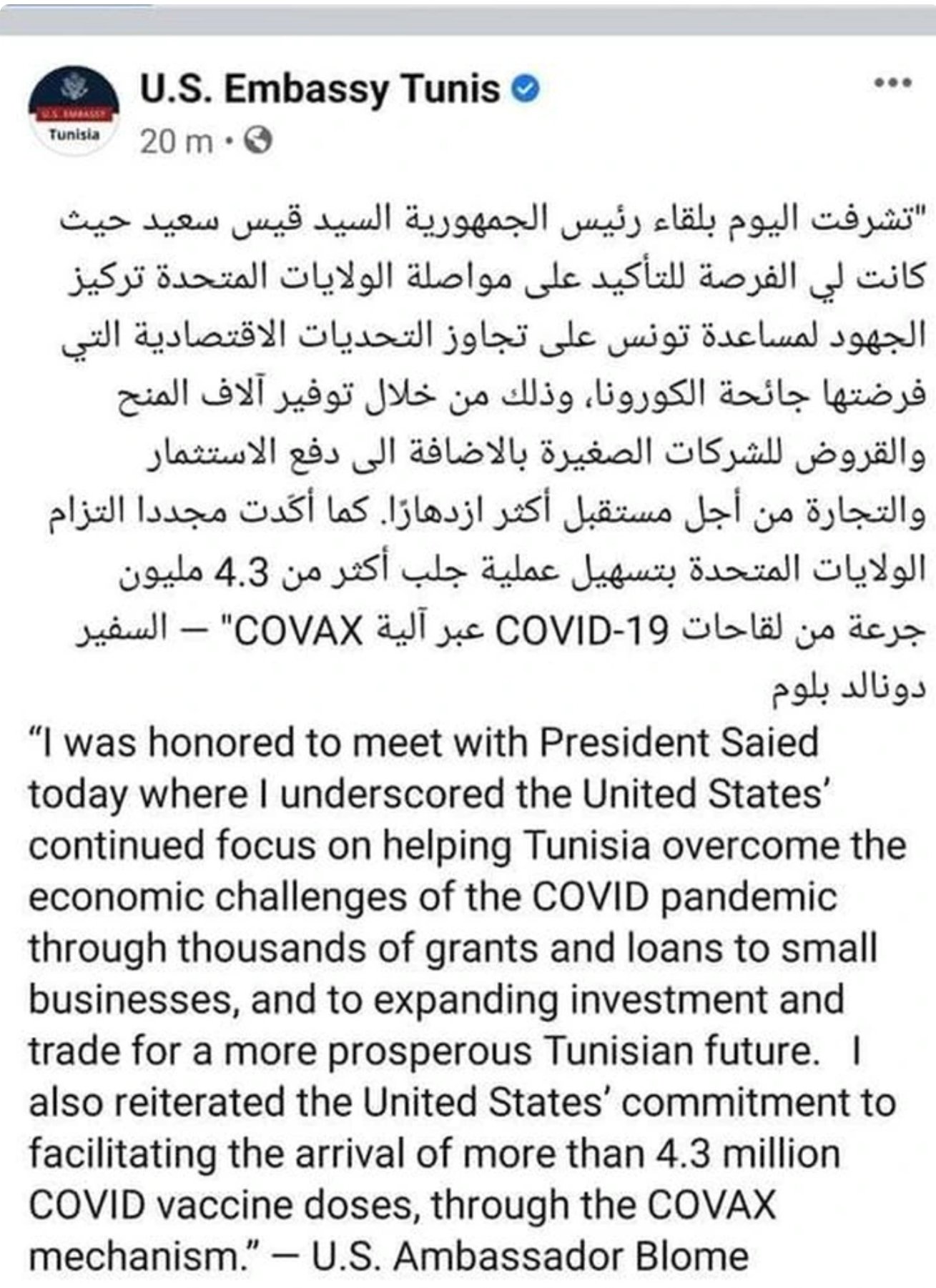 تشرفت اليوم بلقاء رئيس الجمهورية السيد قيس سعيد حيث كانت لي الفرصة للتأكيد على مواصلة الولايات المتحدة تركيز الجهود لمساعدة تونس على تجاوز التحديات الاقتصادية التي فرضتها جائحة الكورونا، وذلك من خلال توفير آلاف المنح والقروض للشركات الصغيرة بالاضافة الى دفع الاستثمار والتجارة من أجل مستقبل أكثر ازدهارًا. كما أكّدت مجددا التزام الولايات المتحدة بتسهيل عملية جلب أكثر من 4.3 مليون جرعة من لقاحات « كوفيد.19 » عبر آلية « كوفاكس » — السفير دونالد بلوم