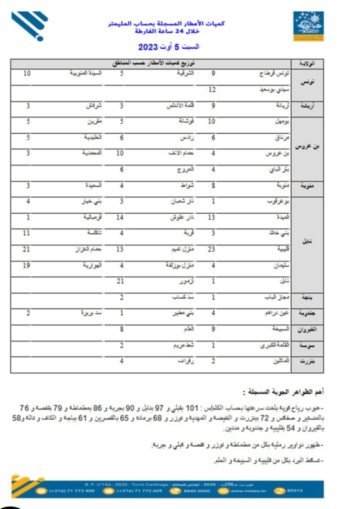 نشر المعهد الوطني للرصد الجوي، اليوم السبت 5 أوت 2023، قائمة لكميات الأمطار المُسجّلة خلال الـ24 ساعة الفارطة في عدد من المناطق في أنحاء البلاد.