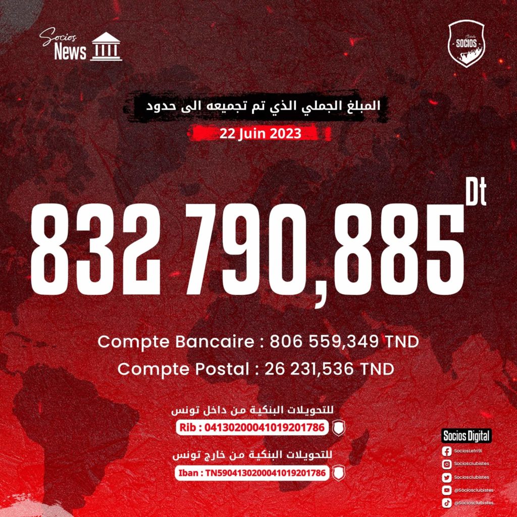 أعلنت جمعية سوسيوس النادي الافريقي في بلاغ رسمي عن التحديث اليومي للمبلغ الجملي الذي تم تجميعه الى حدود يوم 22 جوان 2023 و ذلك من خلال التحويلات البنكية،التحويلات البريدية،و المساهمات المالية التي تم ارسالها عبر منصة سوسيوس النادي الإفريقي.