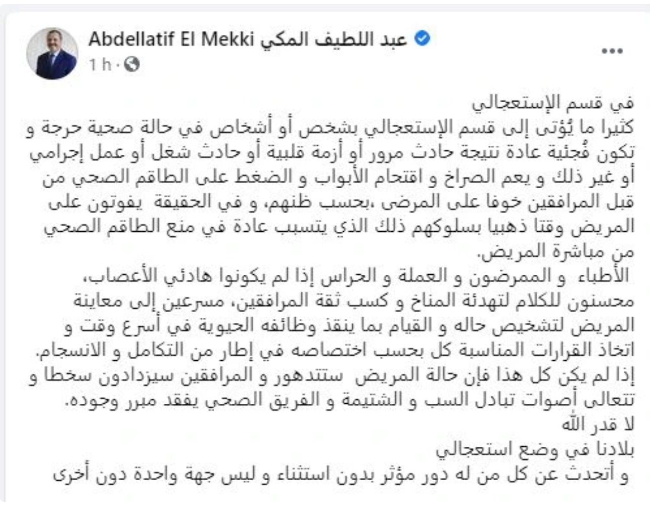 دعا وزير الصحة السابق عبد اللطيف المكي الى التهدئة والى كسب ثقة المواطنين في تدوينة نشرها على صفحته على الفايسبوك اليوم الخميس وشبه فيها تونس بالوضع الاستعجالي والذي يتطلب هدوء الاعصاب والكلام الموزون لتهدئة المناخ وكسب ثقة المواطنين.