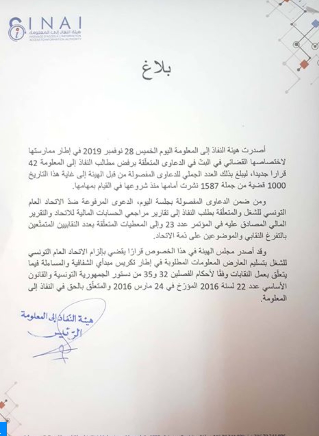 أصدرت هيئة النفاذ للمعلومة قرارا بإلزام الإتحاد العام التونسي للشغل بتمکین النائب السابق، عماد الدایمی، من الوثاٸق المتعلقة بتقارير مراجع الحسابات المالية للاتحاد والتقرير المالي للمنظمة والقائمة في كل النقابيين المتمتعين بالتفرغ النقابی.