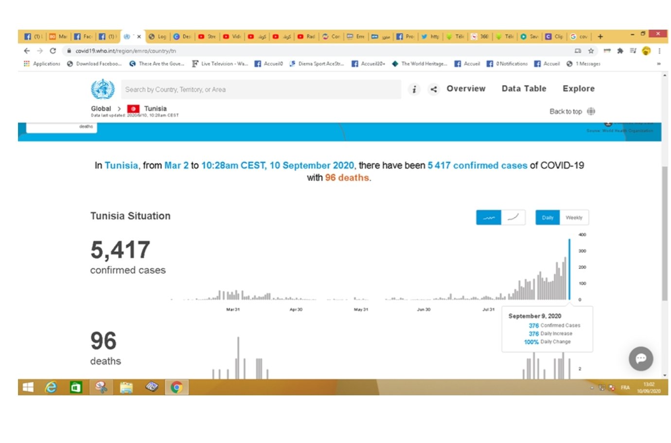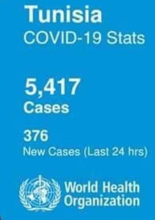 نشرت منظمة الصحة العالمية على موقعها الرسمي ، اليوم الخميس 10 سبتمبر 2020 ، عدد الإصابات بفيروس كورونا التي شهدتها تونس أمس الأربعاء 9 سبتمبر.