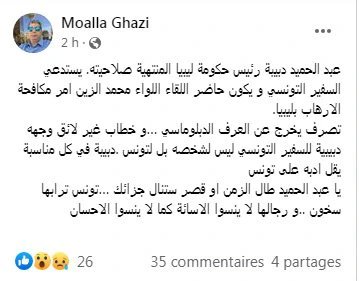 وقال معلّى في تدوينة نشرها على موقع التواصل الاجتماعي فيسبوك، أن ما قام به الدبيبة يعتبر “تصرّفا يخرج عن العرف الدبلوماسي …و خطاب غير لائق وجّهه دبيبة للسفير التونسي ليس لشخصه بل لتونس ..دبيبة في كل مناسبة يقل أدبه على تونس”.