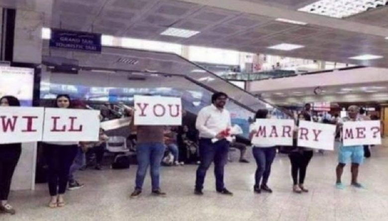 وبعد أن خرجت الحبيبة من قاعة الاجراءات الديوانية فاجئها حبيبها بالجلوس على ركبتيه وقدم لها الخاتم في حين قام اصدقائه برفع لافتات كتب عليها “هل تقبلين الزواج بي”، هذه الحركة اثارت فرح الشابة التي قبلت ان يلبسها الخاتم أمام تجمع الناس الذين أعجبهم هذا المشهد الرومنسي وقاموا بتصويره، غير ان قوات الامن في المطار تدخلت هنا وقامت بإفساد هذا المشهد الجميل حيث ثاموا باقتياد الشاب الى مركز الامن في المطار وذلك بتهمة اثارة الشغب.