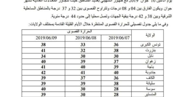 أفاد المعهدالوطني للرصد الجوي في نشرة خاصة أن الحرارة تشهد ارتفاعا بأغلب الجهات بداية من اليوم الجمعة والى غاية يوم الاثنين مع ظهور الشهلي ببقية المناطق..