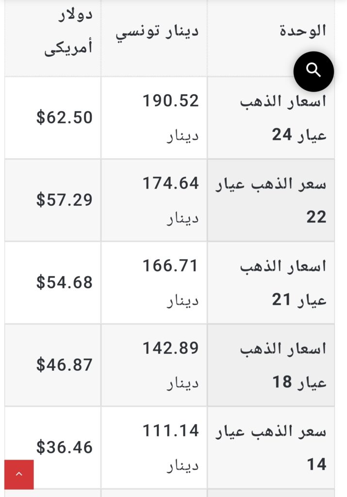 أسعار معدن الذهب اليوم في تونس بالعملة الوطنية الدينار التونسي وأيضا الدولار الأمريكي.