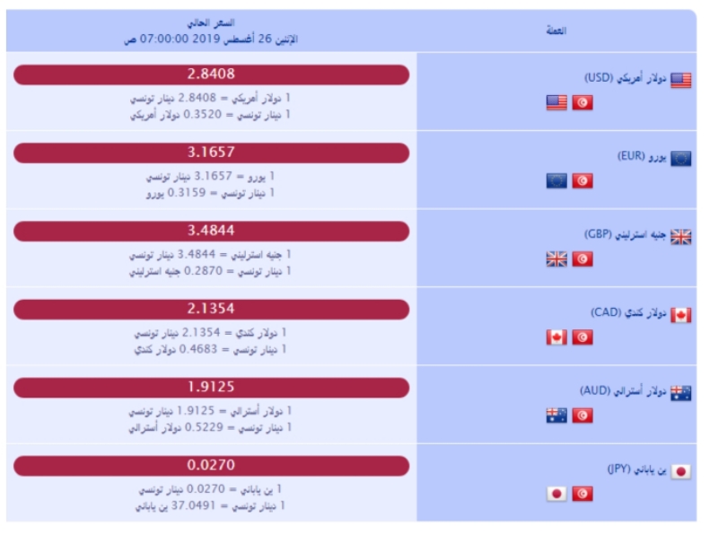 أمّا سعر صرف الدولار الأمريكي فقد بلغ 2.8408 دينار تونسي.