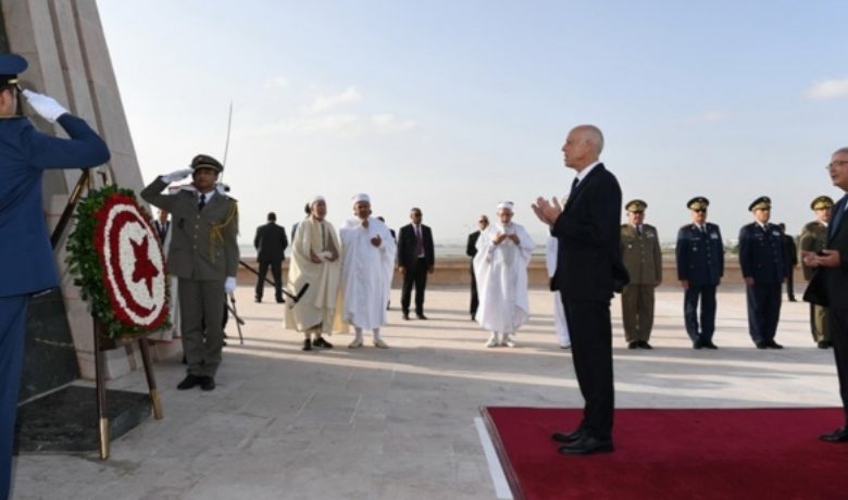 وبعد أداء تحيّة العلم على أنغام النشيد الرسمي واستعراض تشكيلة من الجيوش الثلاثة، وضع رئيس الدولة إكليلا من الزهور على النصب التذكاري وترحّم على أرواح الشهداء الزكيّة.