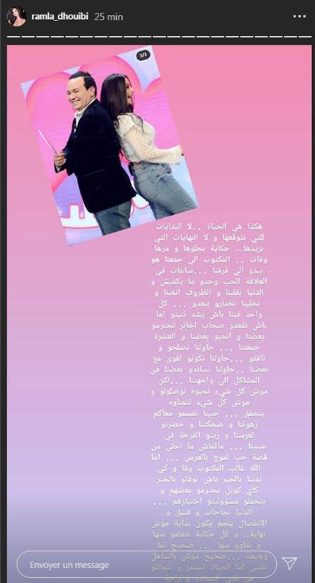 نشرت رملة الذويبي تدوينة على حسابها على انستغرام أكدت فيها أنها انفصلت عن زوجها الإعلامي علاء الشابي.