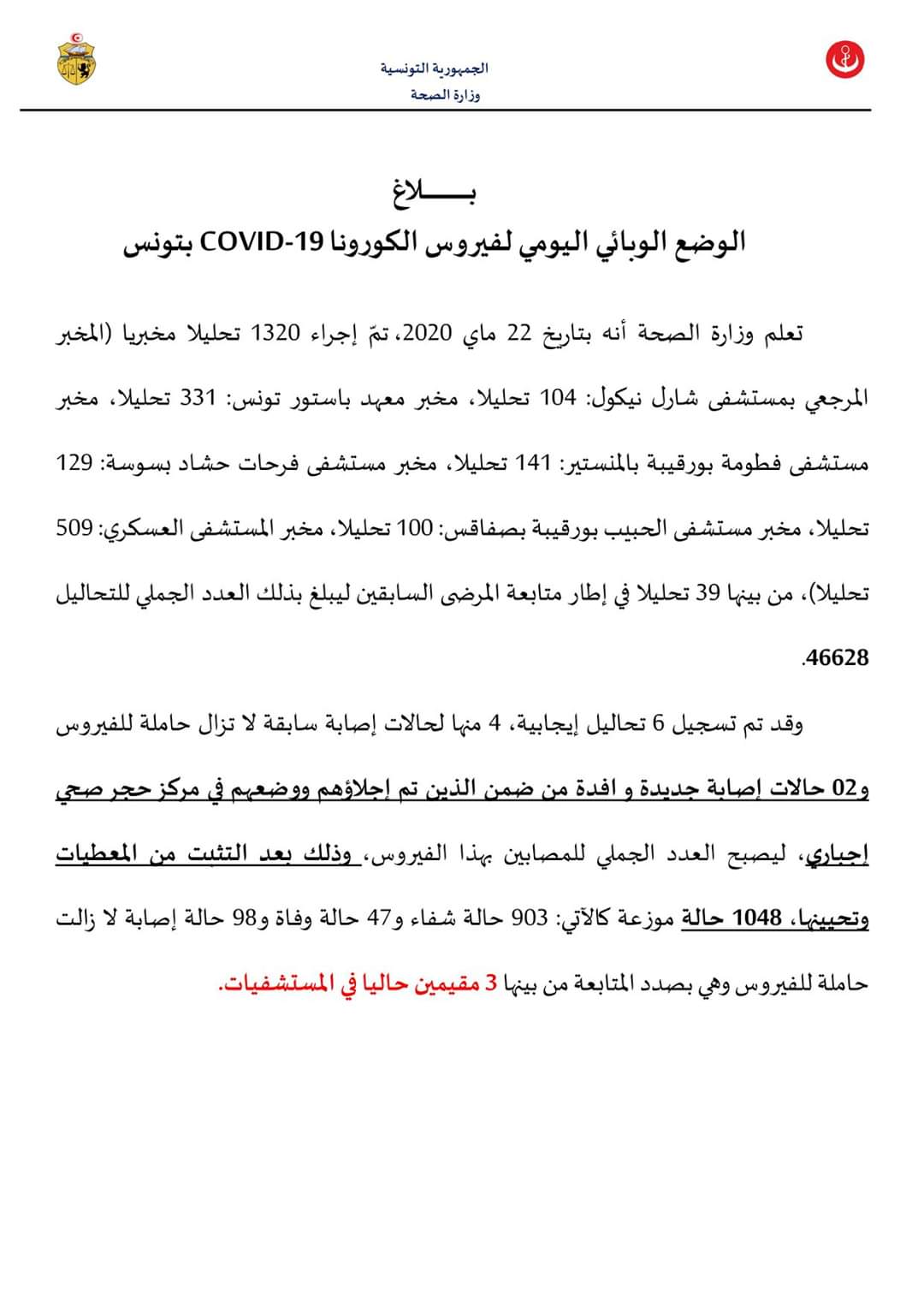 تعلم وزارة الصحة أنه بتاريخ 22 ماي 2020، تمّ إجراء 1320 تحليلا مخبريا (المخبر المرجعي بمستشفى شارل نيكول: 104 تحليلا، مخبر معهد باستور تونس: 331 تحليلا، مخبر مستشفى فطومة بورقيبة بالمنستير: 141 تحليلا، مخبر مستشفى فرحات حشاد بسوسة: 129 تحليلا، مخبر مستشفى الحبيب بورقيبة بصفاقس: 100 تحليلا، مخبر المستشفى العسكري: 509 تحليلا)، من بينها 39 تحليلا في إطار متابعة المرضى السابقين ليبلغ بذلك العدد الجملي للتحاليل 46628.