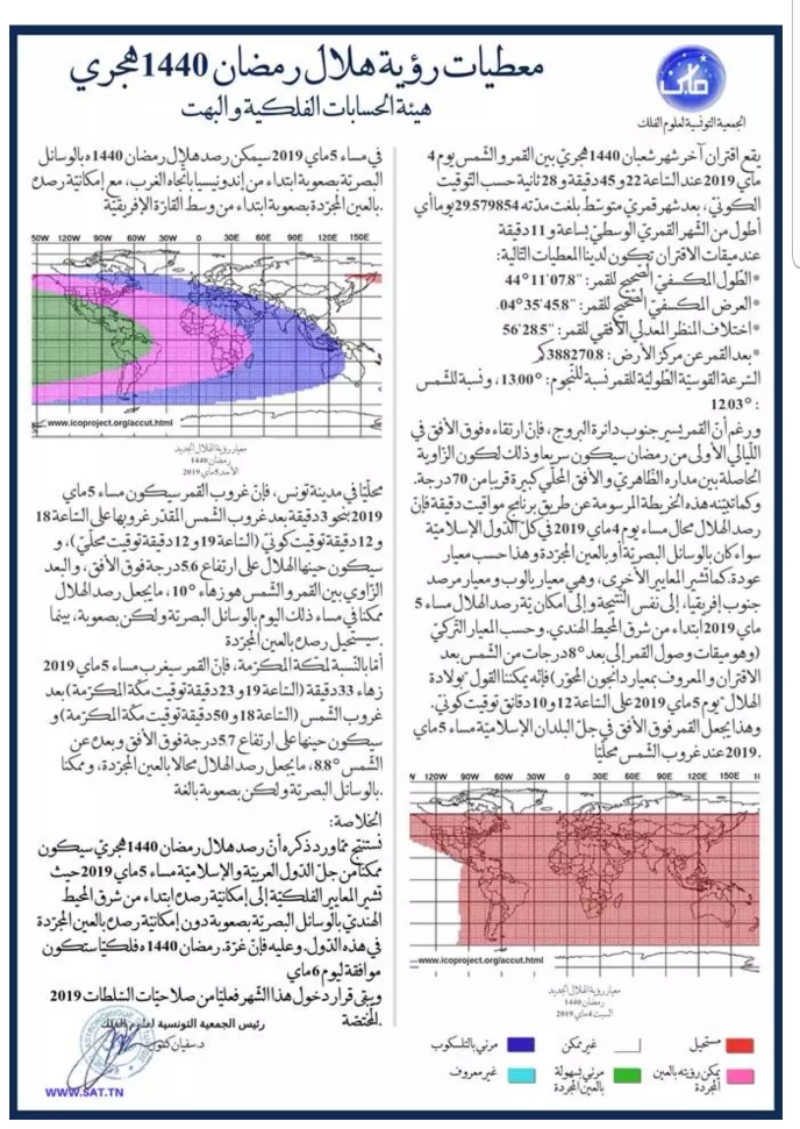 تعلن الجمعية التونسية لعلوم الفلك أنّ رصد هلال رمضان 1440 هجريّ سيكون ممكنا من جلّ الدّول العربيّة والإسلاميّة مساء 5 ماي 2019 حيث تشير المعايير الفلكيّة إلى إمكانيّة رصده ابتداء من شرق المحيط الهنديّ بالوسائل البصريّة بصعوبة دون إمكانيّة رصده بالعين المجرّدة في هذه الدّول. وعليه فإنّ غرّة. رمضان 1440 ه فلكيّا ستكون موافقة ليوم 6 ماي 2019.