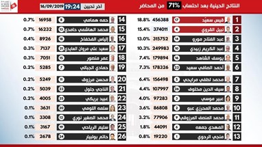 كشفت الهيئة العليا المستقلة للإنتخابات اليوم الإثنين 16 سبتمبر 2019 عن النتائج الأولية عبر احتساب 71 % من محاضر الفرز . وفي ما يلي هذه النتائج :