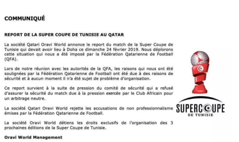 أصدرت الشركة القطرية Oravi World التي أوكلت إليها مهمة تنظيم السوبر التونسي بين الترجي الرياضي و النادي الإفريقي بلاغا صحفيا شرحت من خلاله الاسباب الرئيسية وراء تأجيل موعد المباراة.