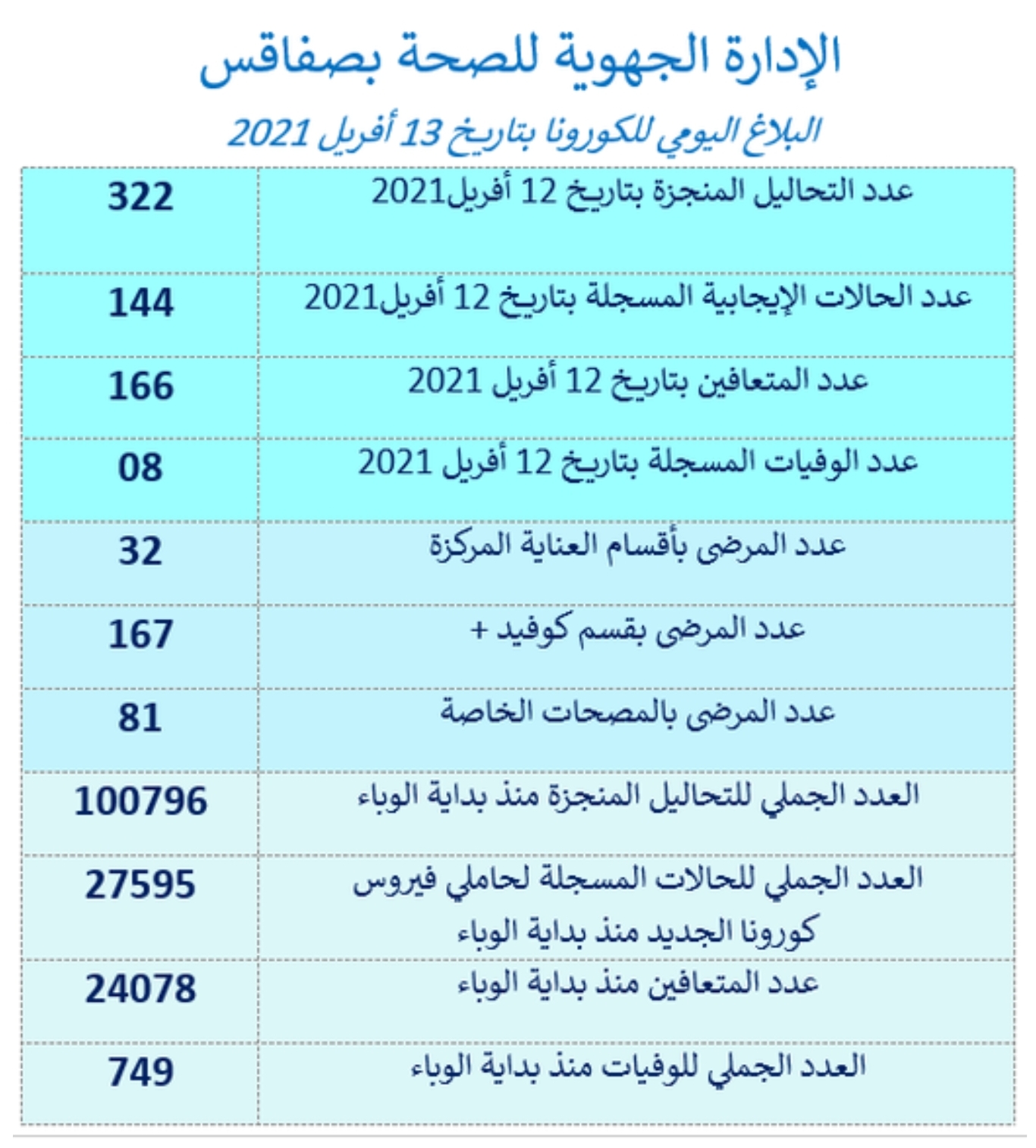 سجلت ولاية صفاقس اليوم، الثلاثاء 13 أفريل 2021، حسب آخر تحيين للوضع الوبائي الصادر عن الإدارة الجهوية للصحة بالجهة، 8 وفيات و144 إصابة جديدة بفيروس كورونا، ليرتفع عدد الوفيات منذ بداية الوباء إلى 749 وفاة وعدد الاصابات إلى 27595.