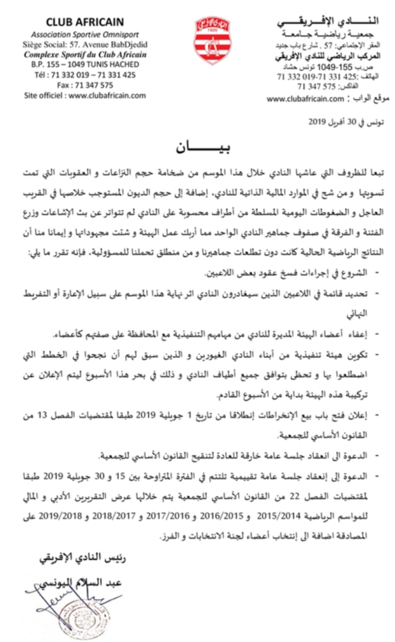 أعلنت هيئة النادي الإفريقي في بيان في ساعة متأخرة من مساء أمس الثلاثاء 30 أفريل 2019 عن جملة من القرارات قالت إنه تم اتخاذها على خلفية ” الظروف التي عاشها النادي خلال هذا الموسم من ضخامة حجم النزاعات والعقوبات التي تمّت تسويتها ومن شحّ الموارد المالية الذاتية إضافة إلى حجم الديون المستوجب خلاصها في القريب العاجل والضغوطات اليومية المسلطة من أطراف محسوبة على النادي أربكت عملها وشتت مجهوداتها” و فيما يلي النص الكامل للبيان :