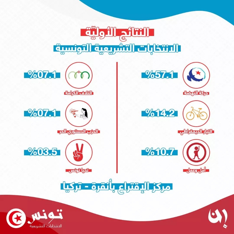 النتائج الأولية للانتخابات التشريعية في مركز العاصمة التركية أنقرة تظهر تقدّم كبير لحركة النهضة امام التيار الديمقراطي امام تراجع احزاب العائلة الديمقراطية..