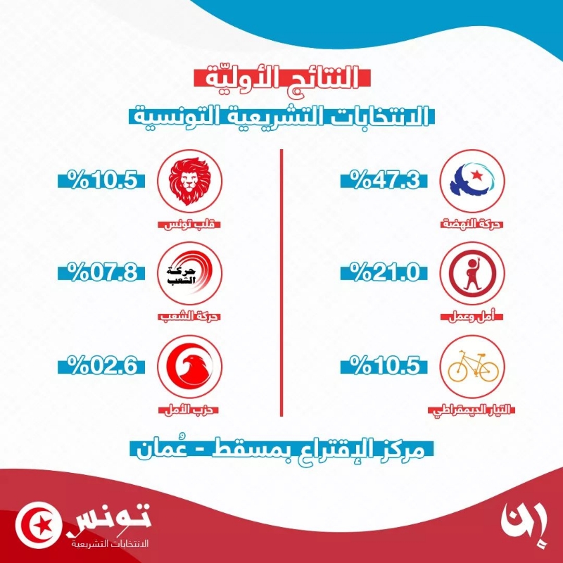 النتائج الأولية للانتخابات التشريعية في مكتب مسقط عاصمة سلطنة عُمان التي اغلاقت المكاتب فيها ابوابها تظهر تقدّم حركة النهضة..