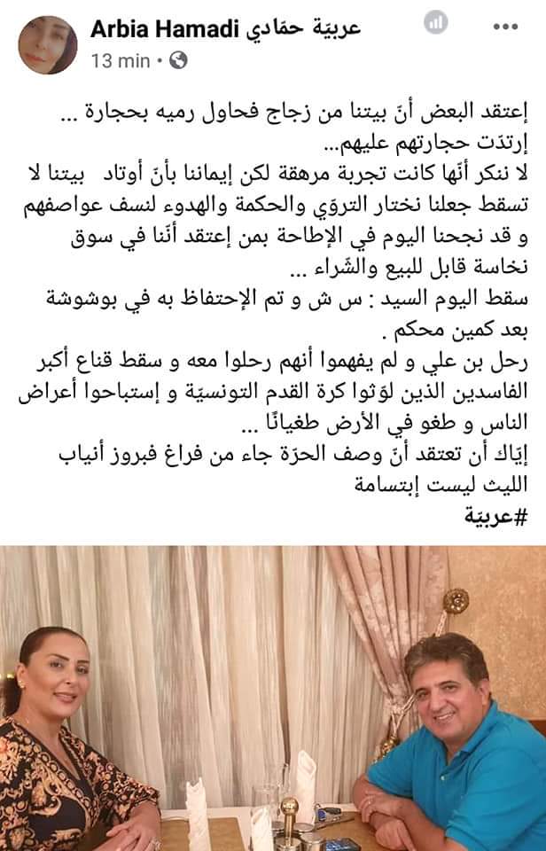 وأضافت عربية حمادي قائلة: “رحل بن علي و لم يفهموا أنهم رحلوا معه و سقط قناع أكبر الفاسدين الذين لوّثوا كرة القدم التونسيّة و إستباحوا أعراض الناس و طغو في الأرض طغيانًا …”، وفق تعبيرها.