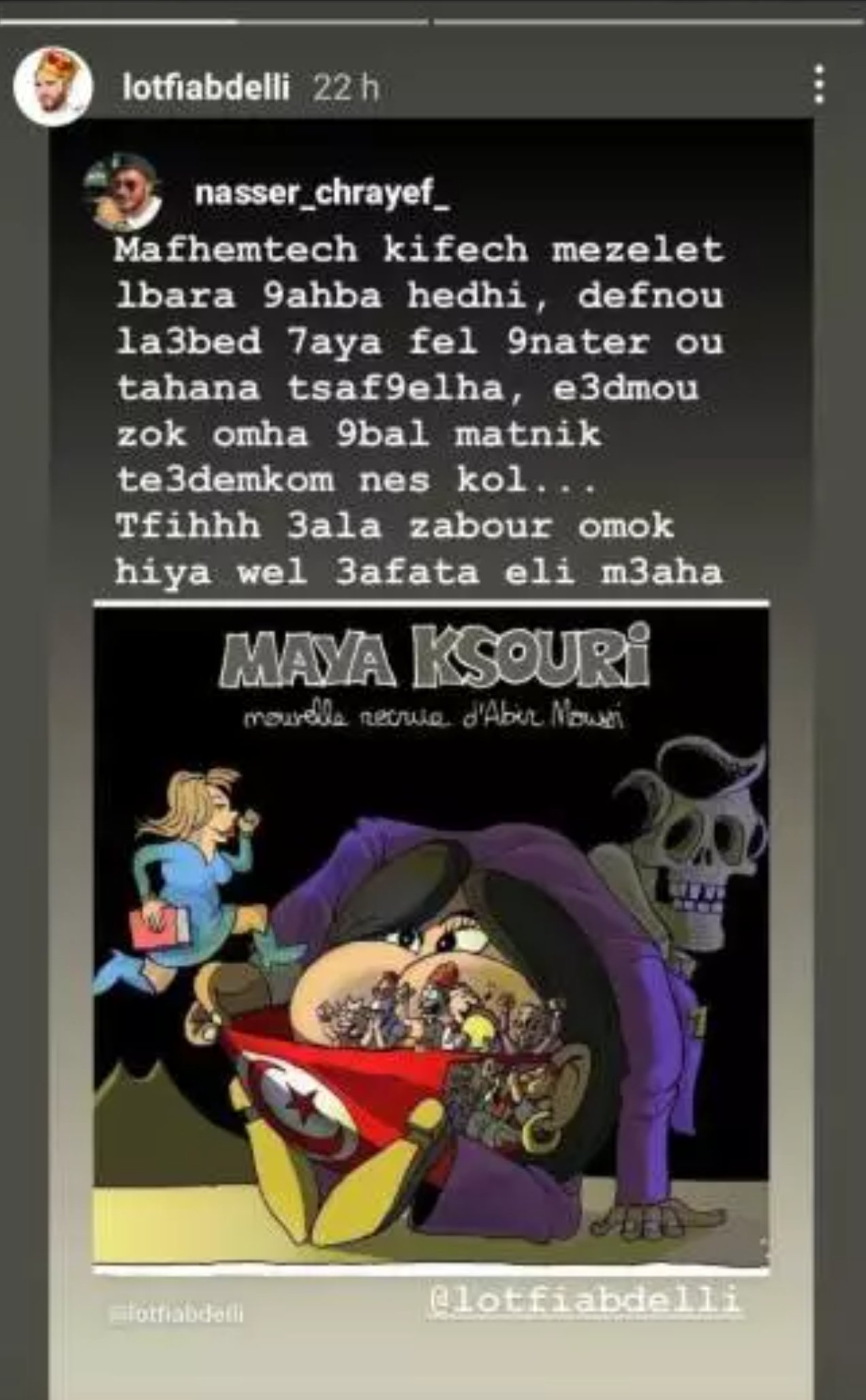 صدم رواد وسائل التواصل الاجتماعي اليوم الأربعاء من ما نشره الفنان لطفي العبدلي على خاصية الستوري عبر تطبيقة انستغرام تجاه الكرونيكاز مايا القصوري ورئيسة الحزب الدستوري الحر عبير موسي.