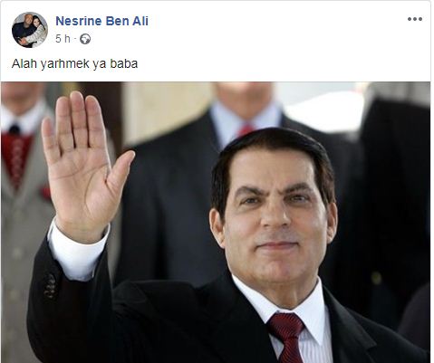 علقت نسرين بن علي إبنة الرئيس المخلوع زين العابدين بن علي على خبر وفاة والدها اليوم الخميس 19 سبتمبر 2019 في السعودية بعد صراع مع المرض.