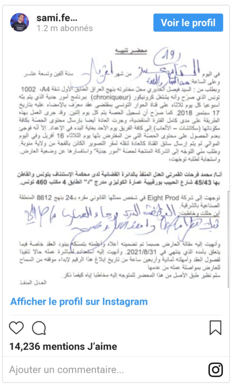 نشر سامي الفهري على صفحته الرسميّة بموقع “أنستغرام” محضر تنبيه أرسله للكرينوكور فيصل الحضيري طالبه فيه بالعودة الى فريق العمل في برنامج أمور جدية.