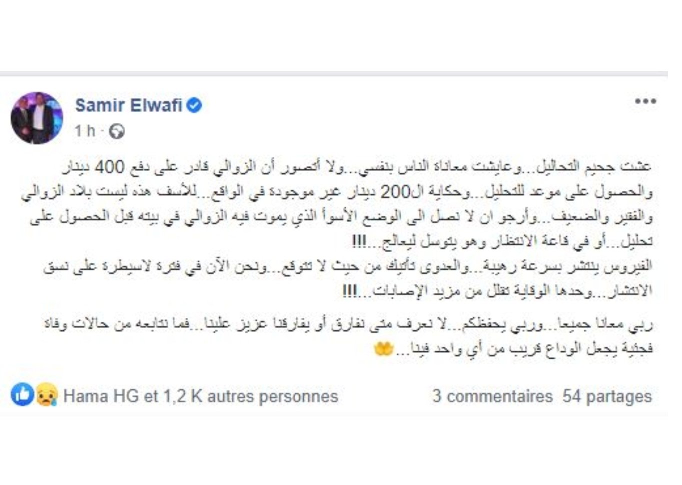 نشر الإعلامي سمير الوافي تدوينة على حسابه الشخصي بالفايسبوك قال فيها بأنه قد “عاش” جحيم تحليل فيروس كورونا ،معتبرا ان ما يروج عن سعر التحليل صحيح و لا وجود لتحليل ب200 دينار معتبرا أن الوضع الوبائي خرج على السيطرة :عشت جحيم التحاليل…وعايشت معاناة الناس بنفسي…ولا أتصور أن الزوالي قادر على دفع 400 دينار والحصول على موعد للتحليل…وحكاية ال200 دينار غير موجودة في الواقع…للأسف هذه ليست بلاد الزوالي والفقير والضعيف…وأرجو ان لا نصل الى الوضع الأسوأ الذي يموت فيه الزوالي في بيته قبل الحصول على تحليل…أو في قاعة الانتظار وهو يتوسل ليعالج…!!! الفيروس ينتشر بسرعة رهيبة…والعدوى تأتيك من حيث لا تتوقع…ونحن الآن في فترة لاسيطرة على نسق الانتشار…وحدها الوقاية تقلل من مزيد الإصابات…!!! ربي معانا جميعا…وربي يحفظكم…لا نعرف متى نفارق أو يفارقنا عزيز علينا…فما نتابعه من حالات وفاة فجئية يجعل الوداع قريب من أي واحد فينا…
