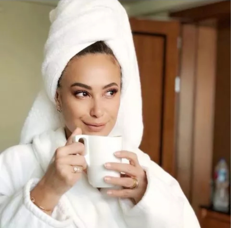 وظهرت الفنانة التونسية هند صبري وهي ترتدي البشكير، والفوطة على رأسها، وممسكة يكون من القهوة الساخنة، وهو ما جعل التعليقات تنهال عليها حول مدى رقتها في هذه الإطلالة.