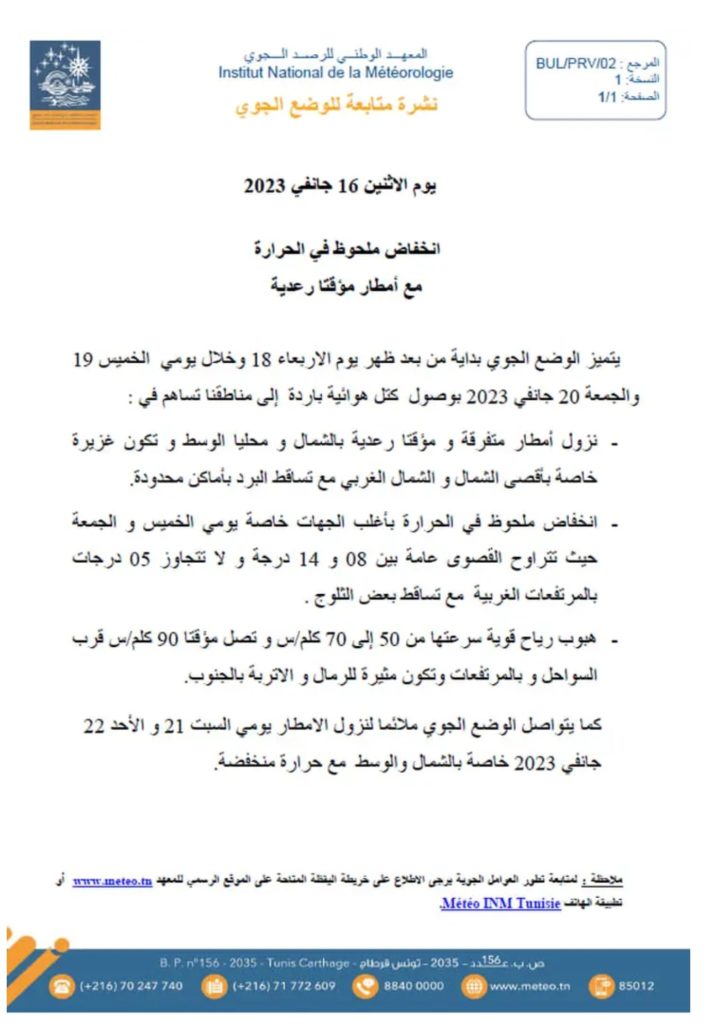Peut être une image de texte qui dit ’المعهد الجوي Météorologie National Institut متابعة للوضع الجوي BUL/PRV/02 يوم الاثنين 16 جانفي 2023 انخفاض الحرارة أمطار مؤقتا الوسط تكون غزيرة محدودة الوضع الجوي والجمعة 20 جانفي الاربعاء وخلال الخميس 19 إلى تساهم نزول أمطار متفرقة مؤقنا عدية بالشمال خاصة الشمال الشمال الغربي مع انخفاض ملحوظفي الحرارة بأغلب الجهات خاصة يومي الخميس الجمعة القصوى عامة تتجاوز 05 درجات الغربية رياح السواحل إلى 70 کلم/س تصل مؤقنا کلم/س قرب 90 وتكون السبت الوضع الجوي ملائما لنزول الامطار جاتفي 2023 خاصة بالشمال والوسط خريطة اليقطة المتاحة على المرقع الرسمي لعهد wwwwr.ineteo.tm ملاطة لمتابعة تطیر العرامل الجرية يرجى الاطلاع تطبيقة نهات 2035’