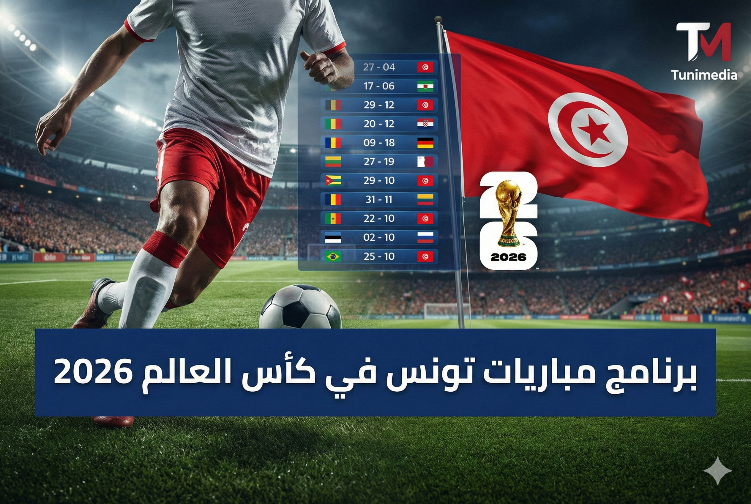 تم الإعلان عن البرنامج الكامل لمباريات المنتخب التونسي في الدور الأول من مونديال 2026، حيث سيخوض نسور قرطاج ثلاث مواجهات ضمن المجموعة السادسة. وتتوزع المباريات على ثلاثة ملاعب مختلفة بين المكسيك والولايات المتحدة الأمريكية، في رحلة تمتد على مدار 11 يوماً. وفيما يلي البرنامج التفصيلي للمباريات: