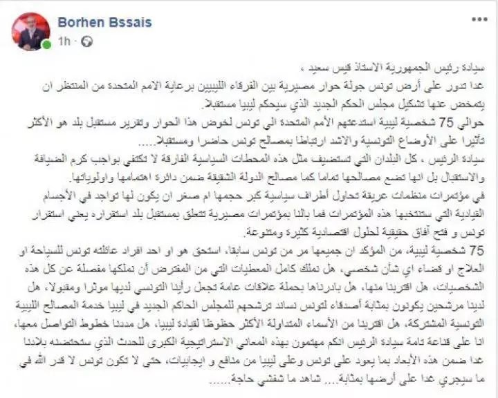 ولفت بسيس ، في منشور على صفحته الرسمية على فايسبوك ، اليوم الأحد 8 نوفمبر 2020 ، إلى أن حوالي 75 شخصية ليبية وقع استدعاؤهم من قبل منظمة الأمم المتحدة إلي تونس لخوض هذا الحوار وتقرير مستقبل بلد هو الأكثر تأثيرا على الأوضاع التونسية والاشد ارتباطا بمصالح تونس حاضرا ومستقبلا.