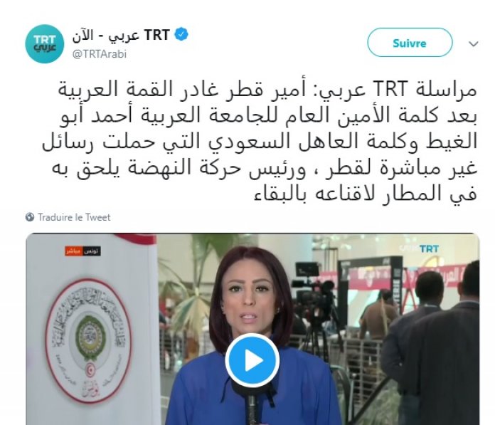 أفادت مراسلة قناة TRT التركية أن أمير قطر تميم بن حمد آل ثاني غادر القمة العربية بعد كلمة الأمين العام للجامعة العربية أحمد أبو الغيط وكلمة العاهل السعودي التي حملت رسائل غير مباشرة لقطر.