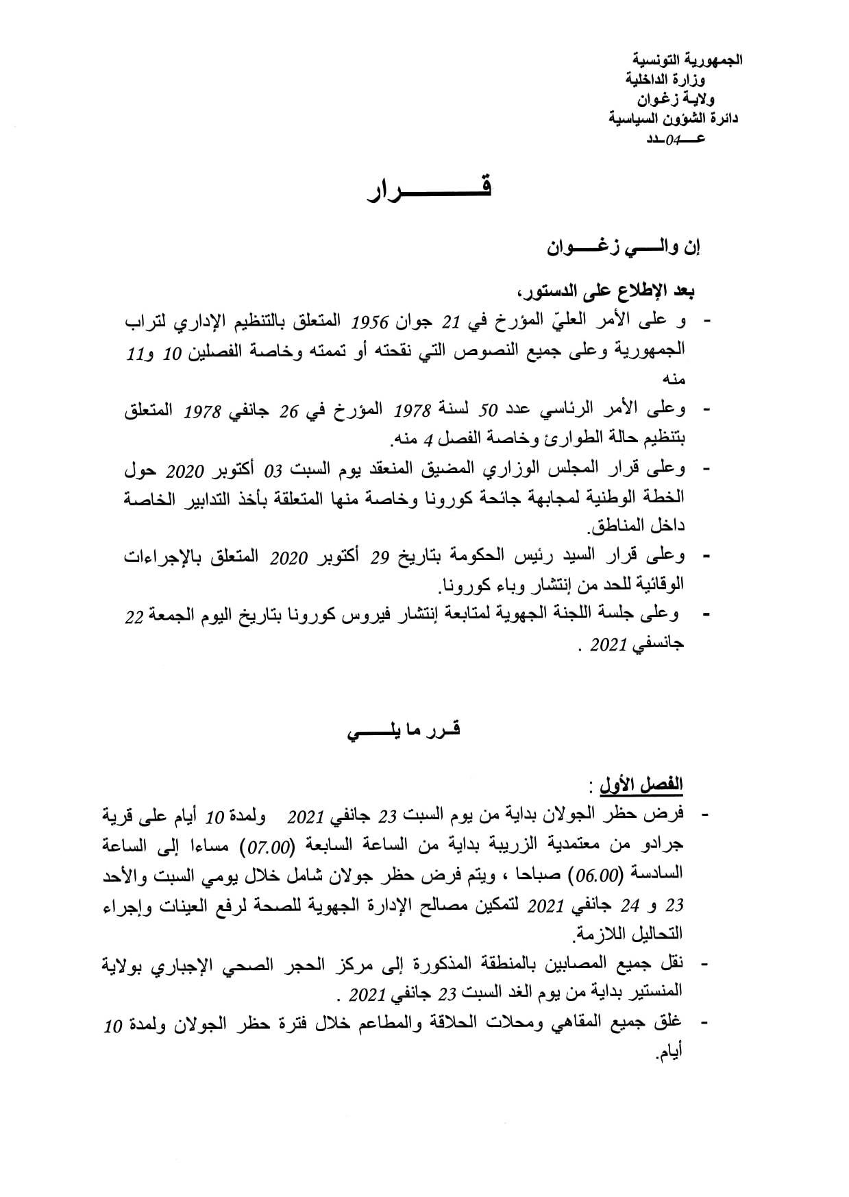قرر والي زغوان صالح مطيراوي، اليوم الجمعة، فرض حظر الجولان في قرية جرادو من معتمدية الزريبة. وسيكون بداية من الغد السبت 23 جانفي 2021.