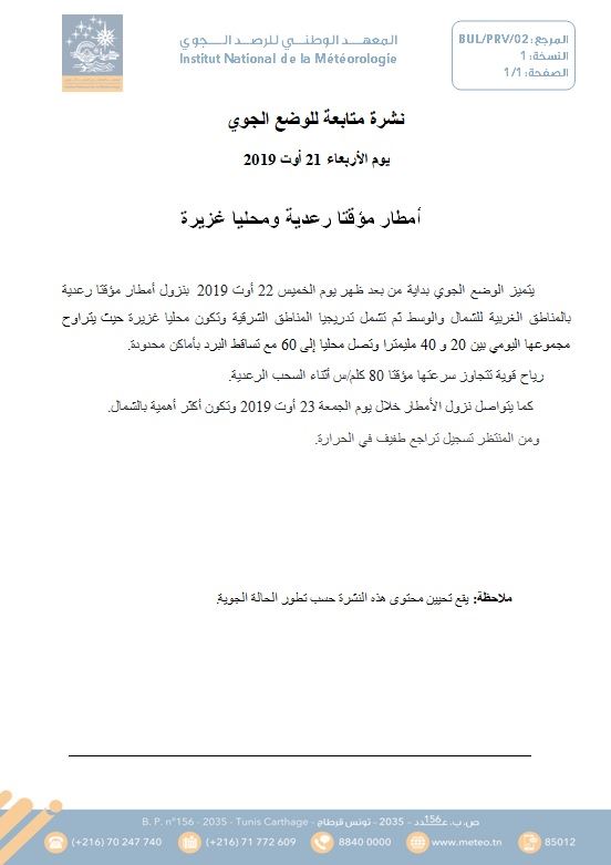 أعلن المعهد الوطني للرصد الجوي في نشرة متابعة أن الوضع الجوي يتميز بداية من بعد ظهر اليوم الأربعاء 21 أوت 2019، بنزول أمطار مؤقتا رعدية بالمناطق الغربية للشمال والوسط ثم تشمل تدريجيا المناطق الشرقية وتكون محليا غزيرة حيث تترواح مجموعها اليوم بين 20 و40ميلمترا وتصل محليا إلى 60 مع تساقط البرد بمناطق محدودة.