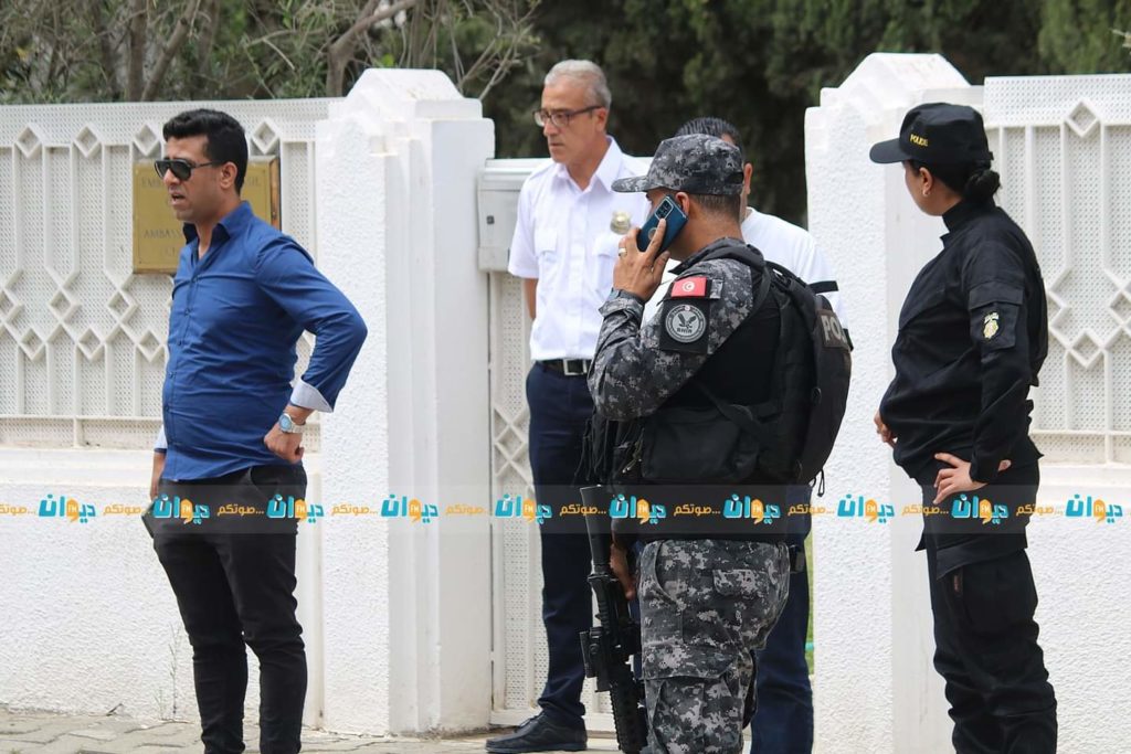 باشرت وحدات تابعة للشرطة الفنية والعلمية صباح اليوم الإثنين عمليات المعاينة الميدانية أمام سفارة البرازيل بتونس إثر تعرض عون أمن لعملية طعن بالمكان