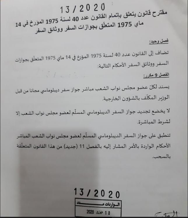صادقت لجنة الحقوق والحريات والعلاقات الخارجية اليوم الأربعاء 20 فيفري 2020 على مقترح القانون المتعلق بإسناد أعضاء مجلس نواب الشعب جوازات سفر ديبلوماسية مجانا من قبل الوزير المكلف بالشؤون الخارجية.