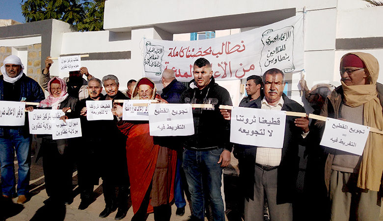 نفّذ صباح اليوم الاثنين 27 حانفي 2020، فلاحو تطاوين وقفة احتجاجية أمام مقر معتمدية الجهة، طالبوا خلالها بحل فوري لاشكالية التزود بالعلف وإنقاذ الثروة الحيوانية من خطر الاندثار، بسبب عزوف العديد من أهالي الجهة عن مواصلة تربية الإبل والأغنام والإضطرار إلى التخلص منها نظرا لارتفاع كلفة رعيهم.