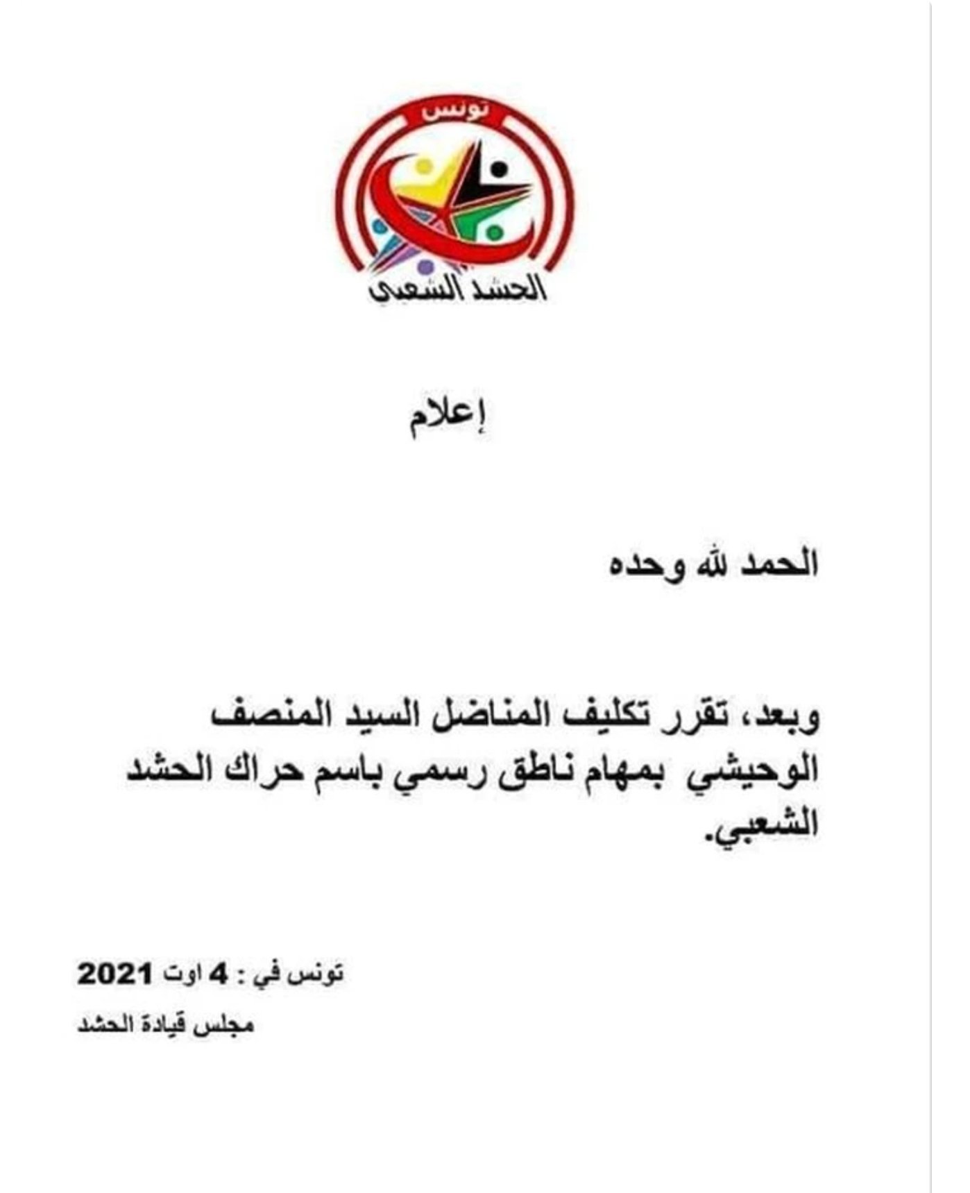 وتم تكليف المنصف الوحيشي بخطة ناطق رسم باسم الحزب