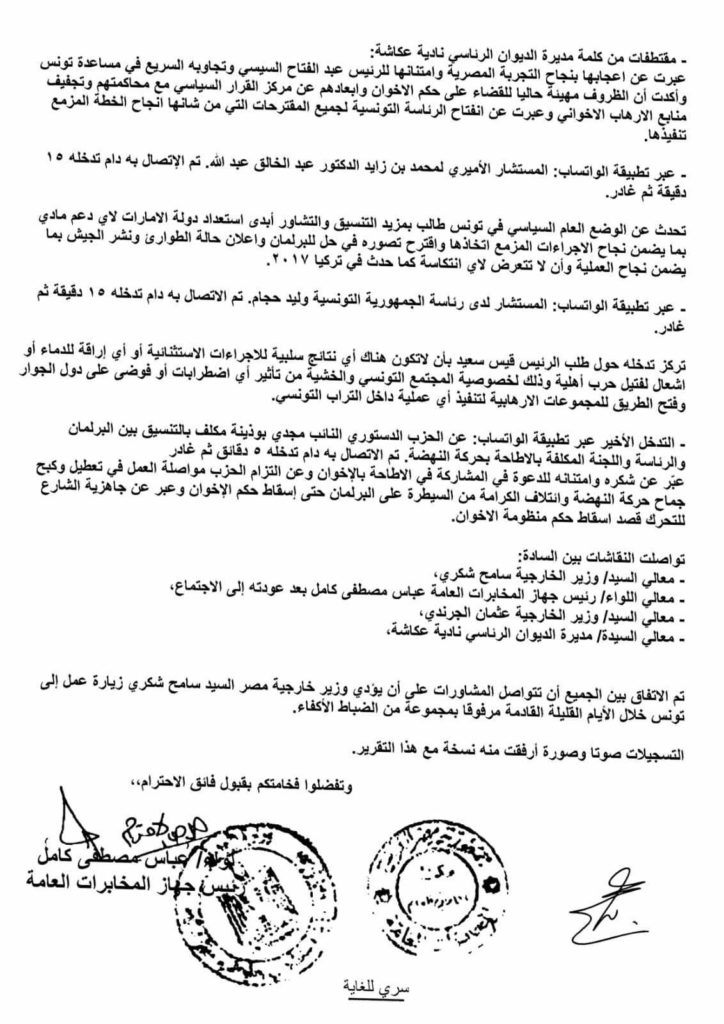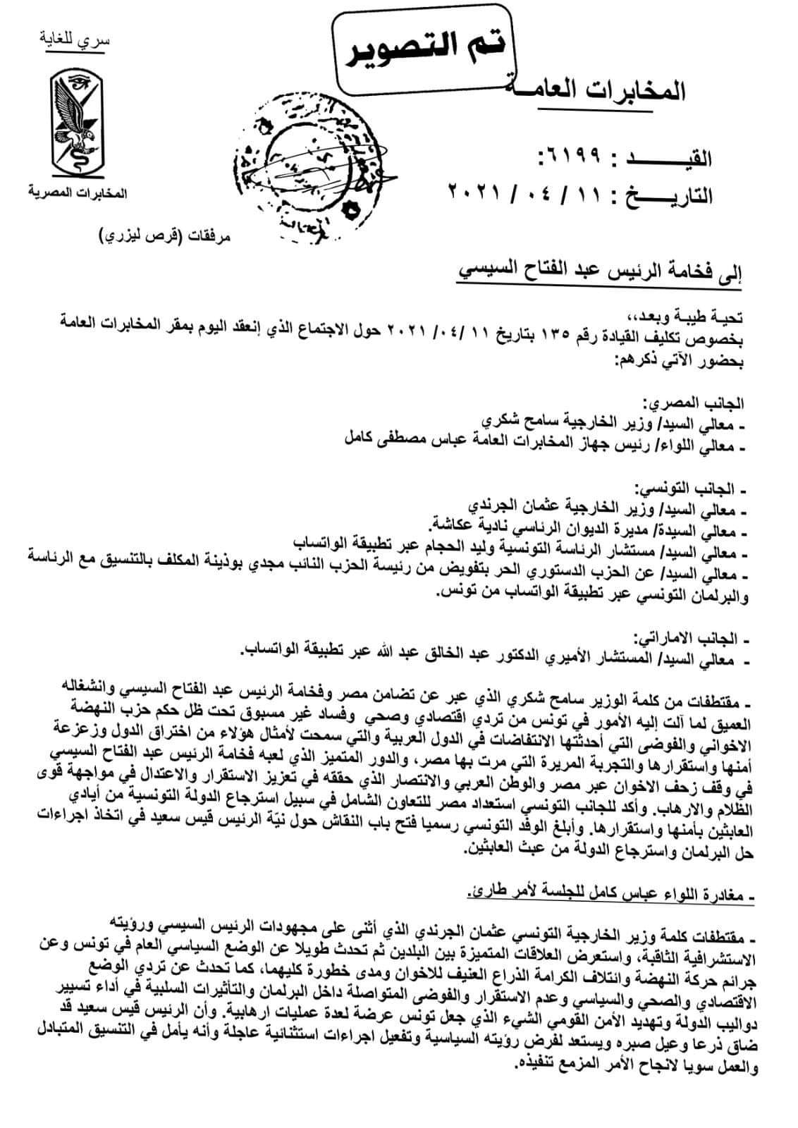 وتشير الوثيقة، وهي عبارة عن رسالة موجهة من مدير المخابرات المصرية عباس كامل إلى الرئيس المصري عبد الفتاح السيسي بتاريخ 11 نيسان/أبريل 2021، إلى اجتماع في القاهرة ضم كلا من عباس كامل ووزير الخارجية المصري سامح شكري، ووزير الخارجية التونسي عثمان الجرندي، ومديرة الديوان الرئاسي التونسي نادية عكاشة، ومستشار الرئيس التونسي وليد الحجام، والنائب عن الحزب الدستوري الحر مجدي بوذينة، إضافة إلى عبد الخالق عبد الله مستشار ولي عهد أبوظبي.