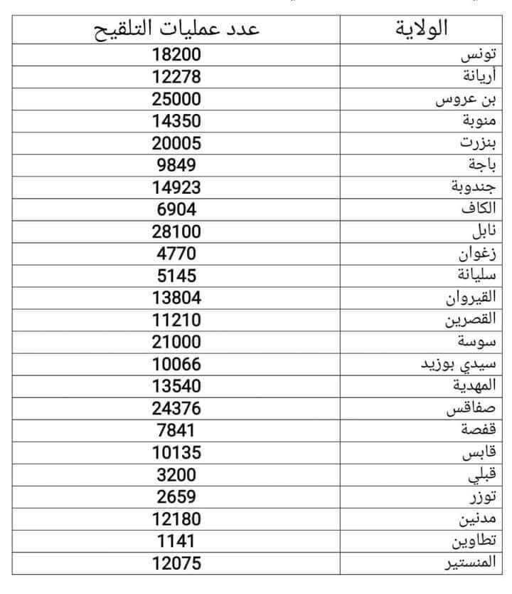 إلى حدود الساعة الواحدة ظهرا سجلت مصالح وزارة الصحة عدد تلقي التلاقيح في كل ولايات الجمهورية قرابة302 الف شخص وتصدرت ولاية نابل قائمة نسبة الملقحين حيث تم تلقيح حوالي28100 شخص ، تليها ولاية بن عروس ب25000 شخص ثم ولاية صفاقس ب 24376 شخص ، ومازالت بقية الولايات لم تسجل النسب المرتقبة رغم عدد سكانها المرتفع، ومازالت عملية التلقيح جارية والمراكز مفتوحة بعد تراجع اقبال المواطنين في فترة بعد الظهر .