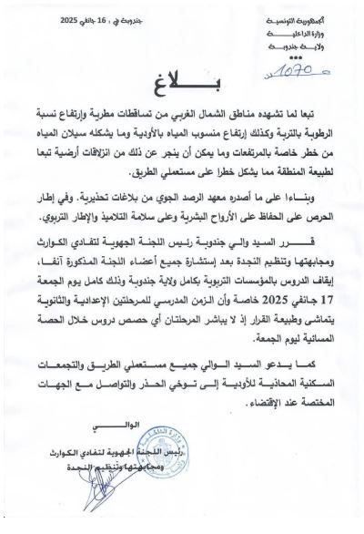 تعليق الدروس غدا بكافة المعاهد و المدارس في هذه الولاية .