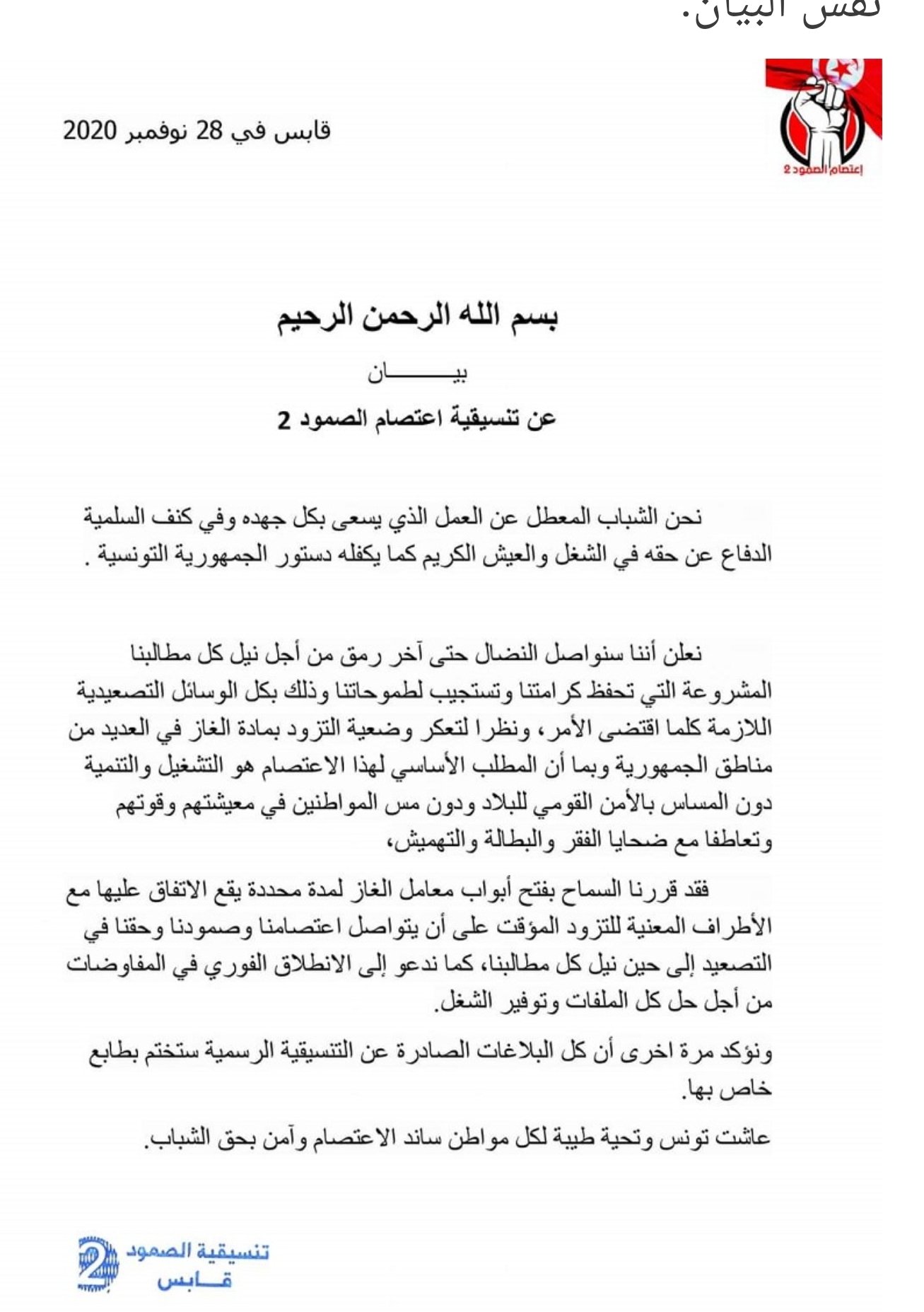 اعلنت تنسيقية الصمود 2 صباح اليوم بالسماح لنعمل الغاز بقابس استئناف العمل ولمدة محددة يقع الاتفاق عليها مع الاطراف المعنية للتزود المؤقت على ان تواصل اعتصامها حتى نيل كل المطالب والانطلاق الفوري في المفاوضات من اجل كل الملفات وتوفير الشغل وفق بيان صادر عن التنسبقية. ويأتي قرار التنسيقية بعد ما اعتبرته تعكر وضعية التزود بالغاز في عديد مناطق الجمهورية والمخافظة على الامن القومي للبلاد ودون مس المواطنين في قوتهم ومعيشتهم وفق نفس البيان.