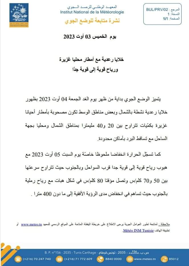 تونس غدا: امطار غزيرة مع انخفاض في درجات الحرارة أعلن المعهد الوطني للرصد الجوي، اليوم الخميس 3 أوت 2023 أن الوضع الجوي سينقلب بداية من يوم غد الجمعة