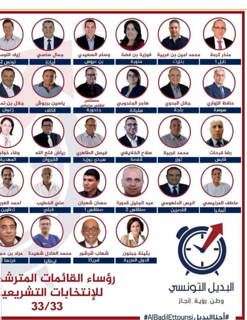 أعلن حزب البديل التونسي عن تقدمه للإنتخابات التشريعية بقائماته الانتخابية في 33 دائرة إنتخابية و فيما يلي أسماء رؤساء قائمات الحزب المذكور في جميع الدوائر الانتخابية :