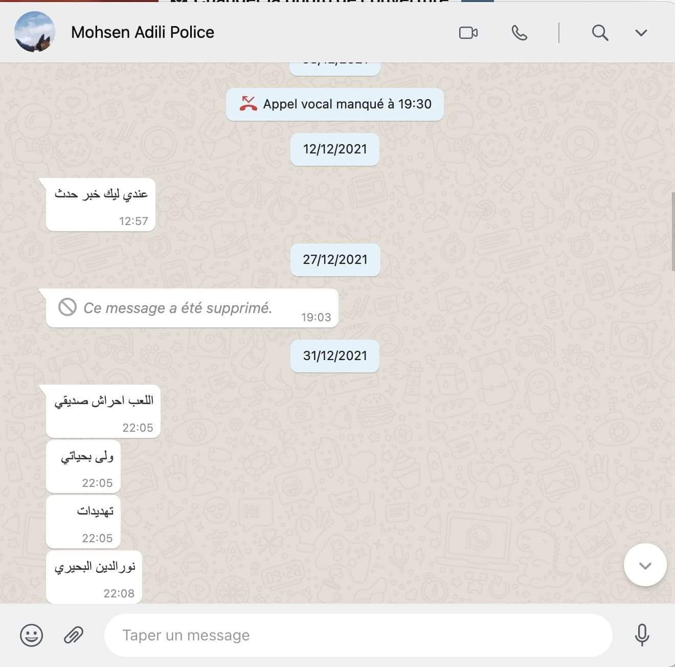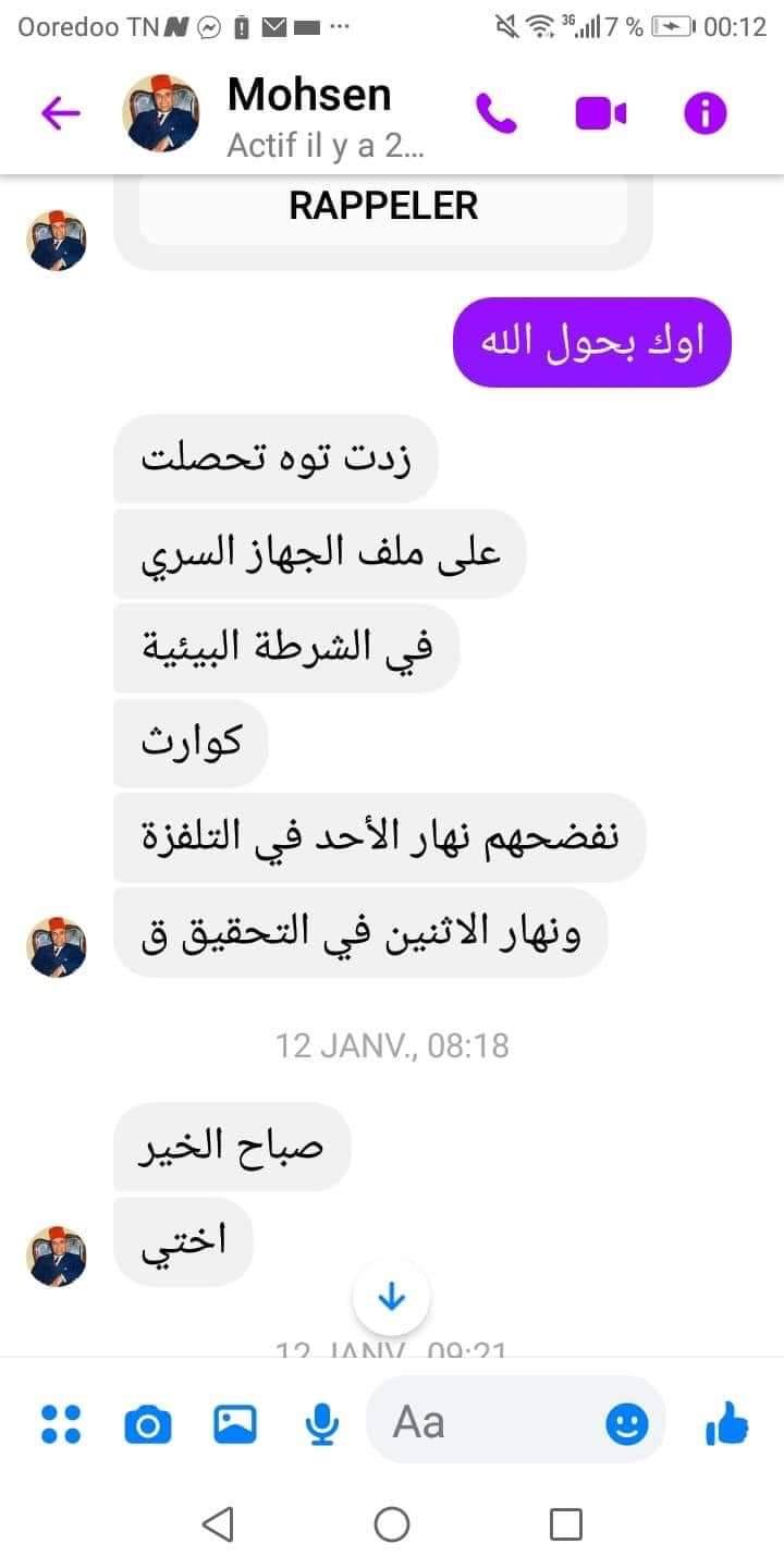 السيد هذا هو الي فضح فساد و ملف نورالدين البحيري و من وقتها و هو تحت التهديد و لا قيس سعيد لا وزير الداخلية تدخلو باش يحميوه ، و هاذوكم ميساجات بينو و بين مدوّن و محامية… من المفروض اليوم 17 جانفي يعطي شهادته حول الملف في القطب القضائي و المالي و يزيد يأكد تورّط البحيري، لكن طالته يد الغدر قبل بليلة ، دخلو لداره قتلوه و خرجو بنظافة و قيّد على انتحر …