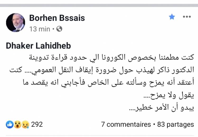 نشر الإعلامي برهان بسيس تدوينة على حسابه الشخصي بالفايسبوك قال فيها ان الامر خطير في علاقة بإنتشار فيروس كورونا ،و استند بسيس الى تدوينة نشرها الدكتور ذاكر لشيهب الذي دعا لإيقاف استعمال النقل العمومي