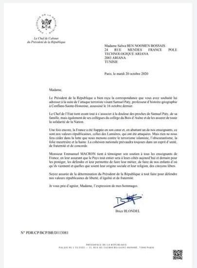 بعد نهارين نتفاجؤو انو الرئاسة الفرنسية ترجعلها رسالة باسم الايليزي مصححها مدير ديوان الرئيس فيها عبارات الشكر والتقدير على موقف التعاطف والتضامن…..