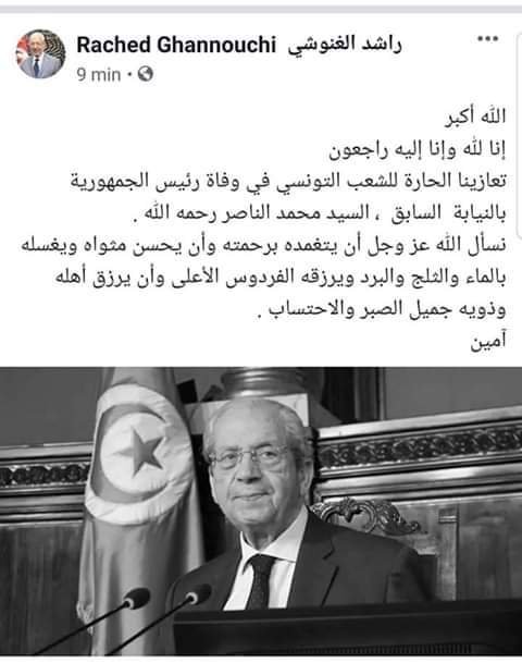 نعى رئيس حركة النهضة راشد الغنوشي رئيس مجلس نواب الشعب السابق و القائم بمهام رئيس الجمهورية السابق محمد الماصر الذي وفته المنية فجر اليوم السبت.